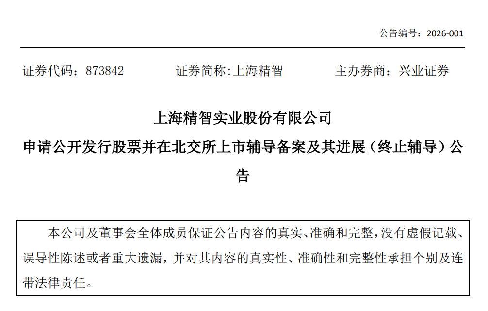 正在上海精智颁布发表拟刊行H股后不久,公司随即发布通知布告,颁布发表终止此前正在北交所的IPO。通知布告称,这是分析考虑公司成长计谋、当前本钱市场和政策等要素后,取机构兴业证券敌对协商做出的决定。2025年12月26日,兴业证券向上海证监局报送了终止存案材料,并于2026年1月4日获得确认。