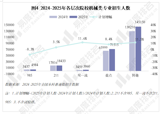 985院校机械类招生人数波动式下降,较2024年缩减8。3%,其他各条理院校则有3%-12%的涨幅,以更大的体量支持机械类招生总规模的抬升。985院校缩减机械类专业招生规模已是常态,2021-2023年“三连降”,2024年急速回升,本年又起头下滑,华中科技大学、大连理工大学较客岁降幅达28%、23%。但并非大热专业,尚处于新老专业更替期间,保守专业仍是招生从力,这就导致部门院校正在招生策略调整时将更多比例投放至市场需求度更高的专业,以“机械五虎”之一华中科技大学为例,2025年机械类招生打算较上一年降幅高居各专业类第一,电子消息类专业则扩招最多。