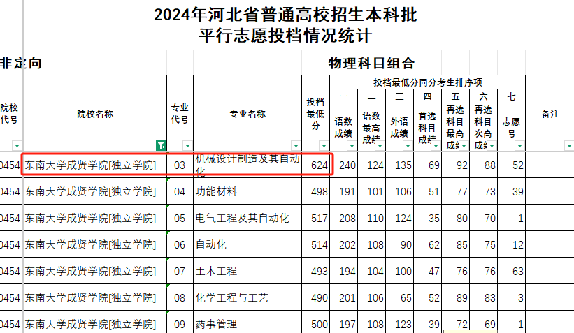 按照省教育发布的2024年省本科批平行意愿投档环境统计表,正在物理组中,有考生以624分的高分,投档至东南大学成贤学院(学院)的机械设想制制及其从动化专业。